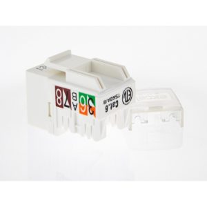 Toma RJ45 sin apantallar de Categoría 6 en formato Keystone corto para transmisión de datos de hasta 1Gigabit Ethernet en color blanco. Terminación mediante herramienta inserción tipo 110. Ref. fabricante : 100-011